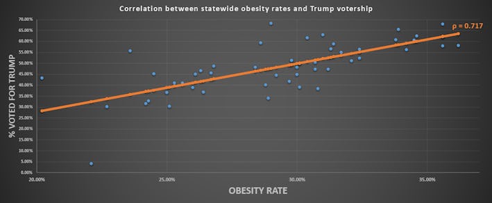 Trump voters and obesity has a strong positive correlation, at 0.717.Reddit,